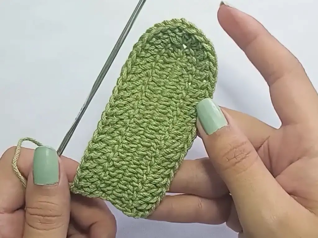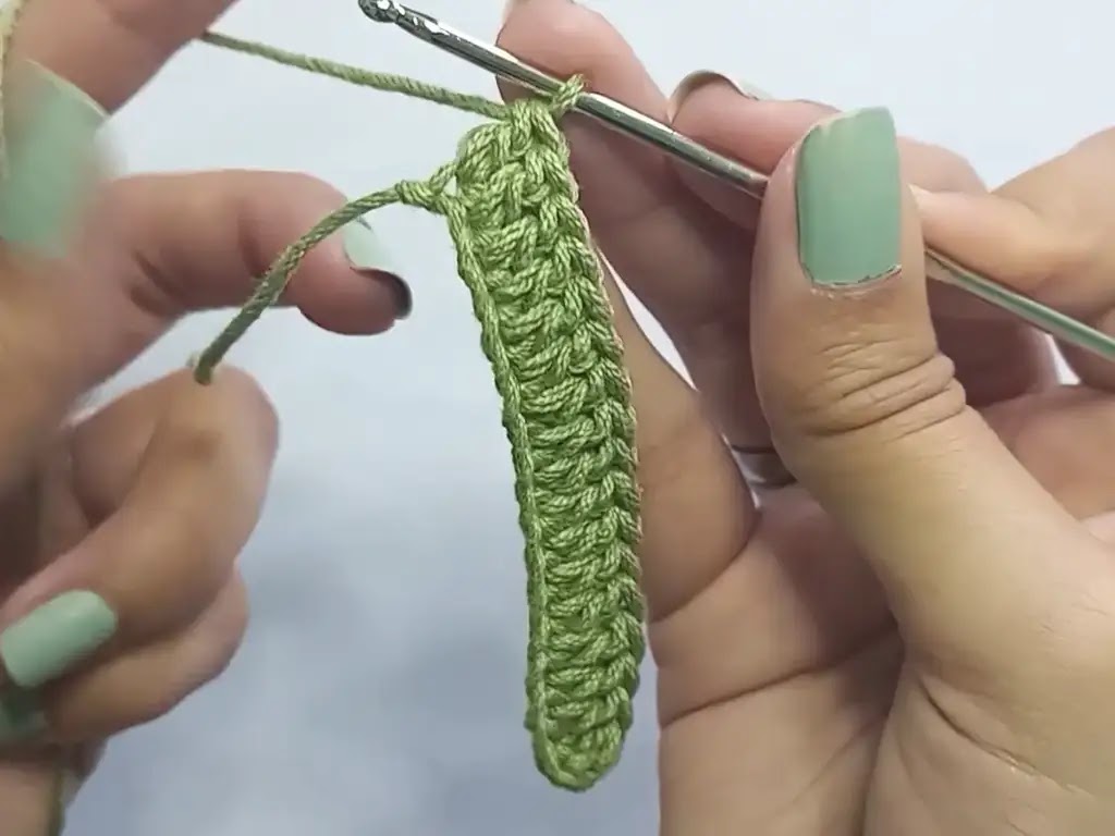- Row 2: Chain 2 (counts as your first stitch), half double crochet into the first stitch, double crochet into the following stitch, repeat (hdc, dc) twice, and finish with a half double crochet (5 stitches total).