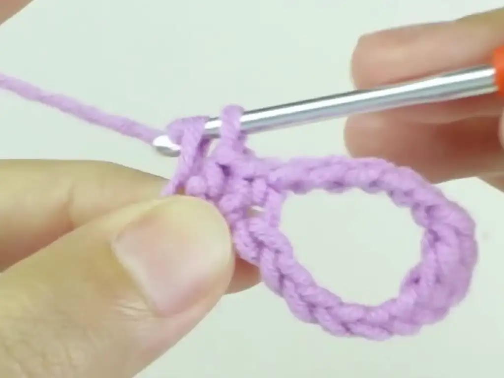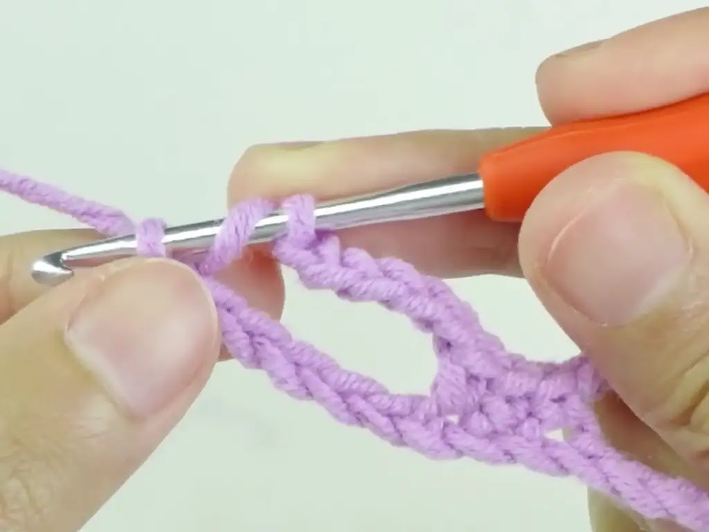 - Ch 5, skip 5 chains, sc into the next 3 chains, ch 5, skip 5 chains, dc into the next 4 chains
