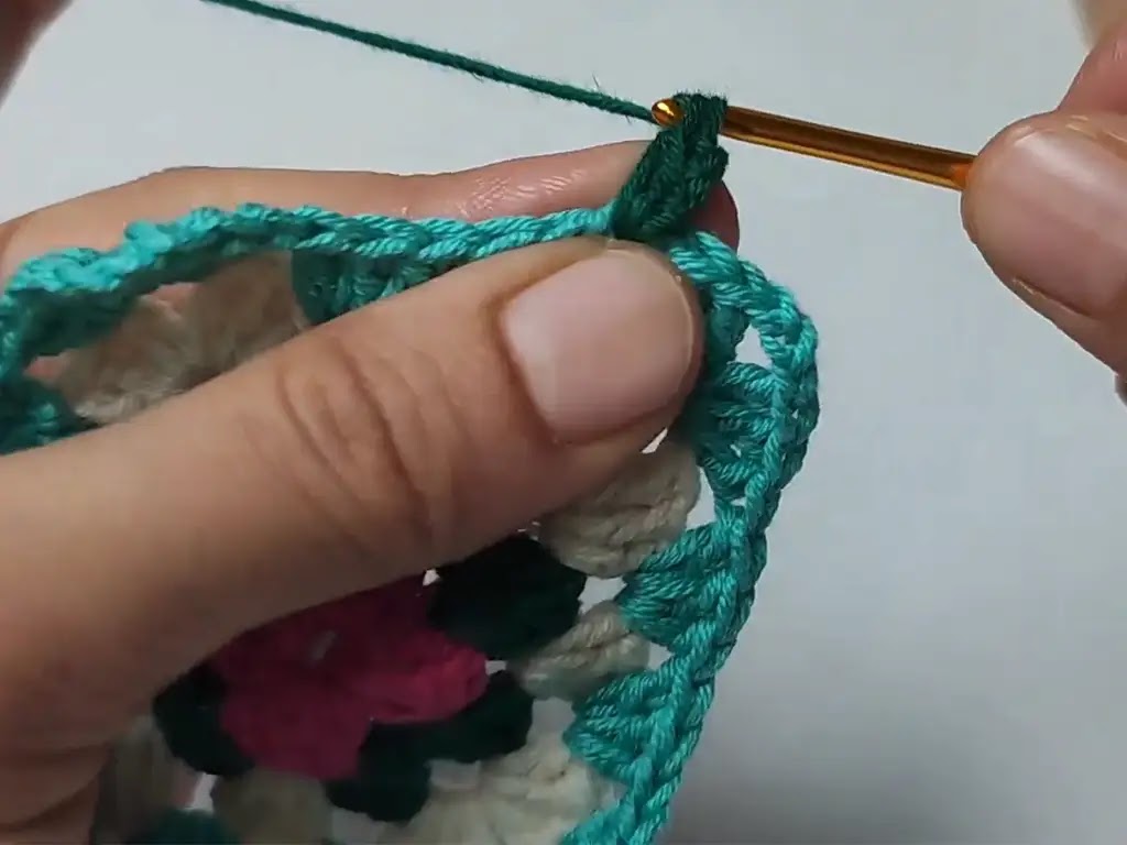 - Work (3 dc, ch 3, 3 dc) in each corner space.