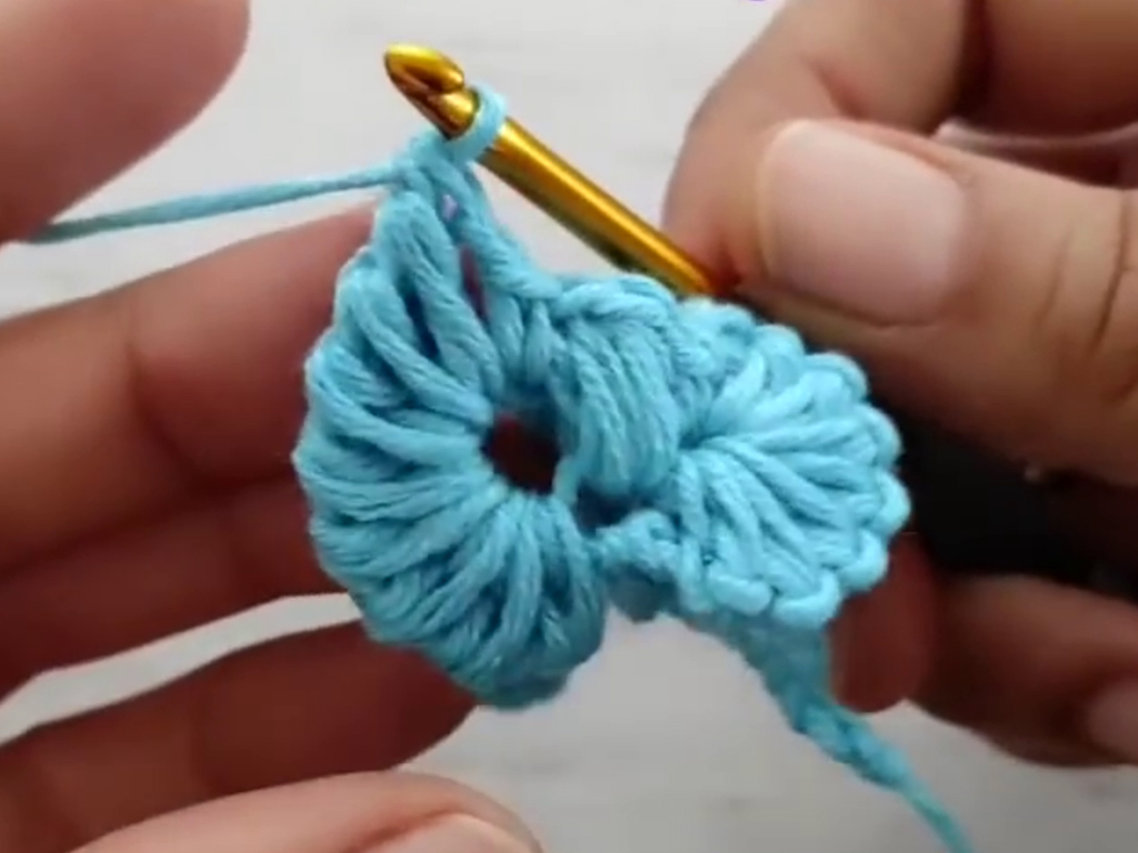 - Chain 1, then in the loop space from the row below, yarn over 8 times and make a puff stitch.