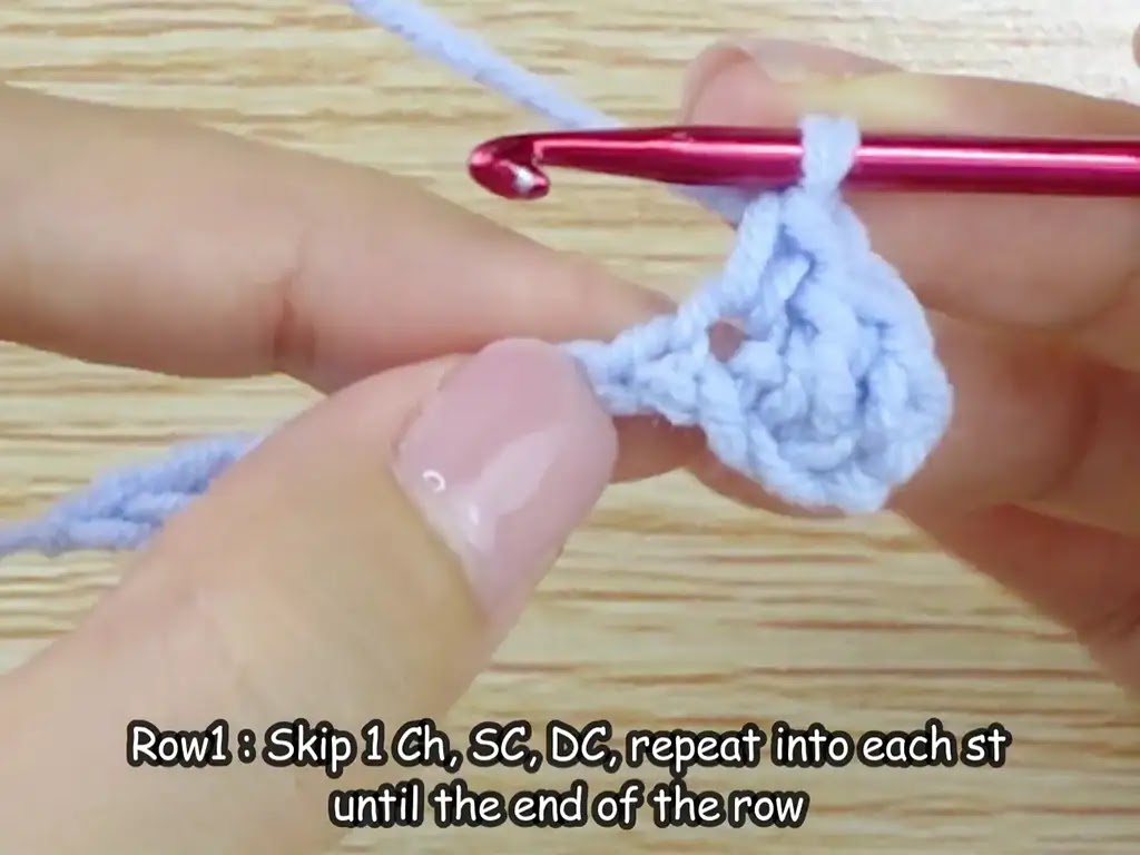 - Row 1: Skip 1 chain, single crochet (sc) in the next chain, double crochet (dc) in the next chain, sc in the next chain. Repeat from * to the end of the row.