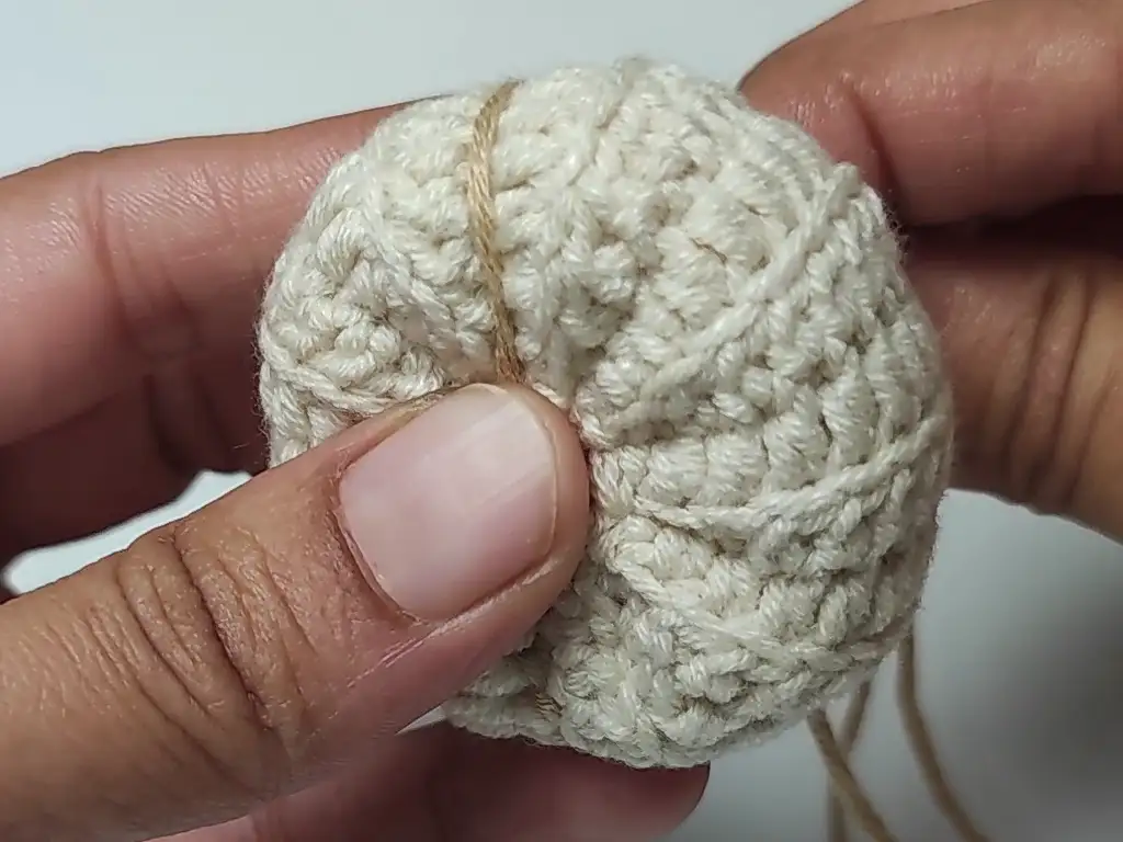- Repeat for all 8 ridges, pulling slightly tight each time to define the pumpkin shape.