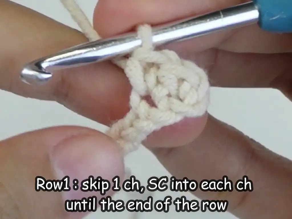 - Row 1: Sc into the second chain from the hook and in each ch across.