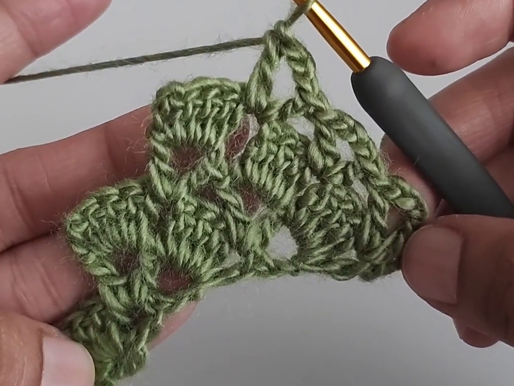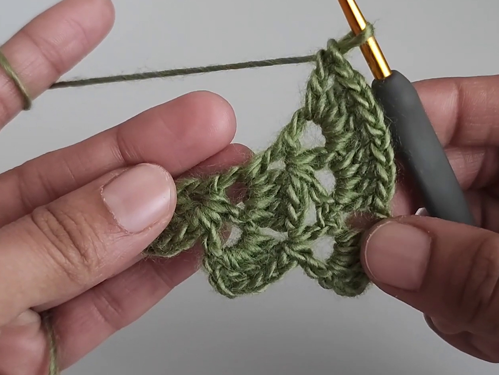 - Continue this pattern as you create V stitches and double crochet groups.