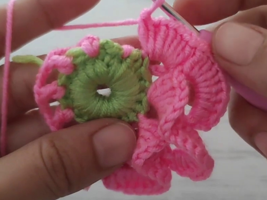 - Round 2: Chain 3 (counts as first dc). Work 4 dc in the same stitch as join. Slip stitch in the next stitch, 5 dc in the next stitch. Repeat from * to * around. You should have 6 petals.