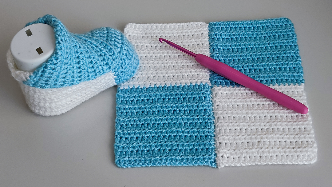 stitch across for a total of 18 hdc. Repeat this step for 12 rows in blue, creating a