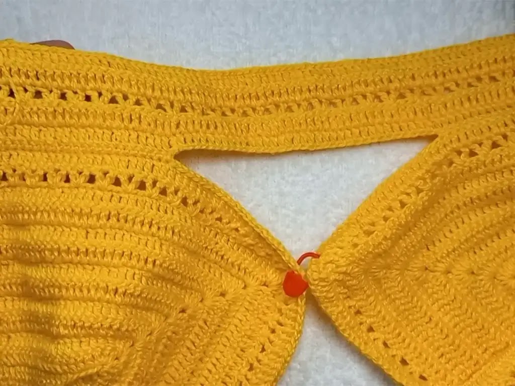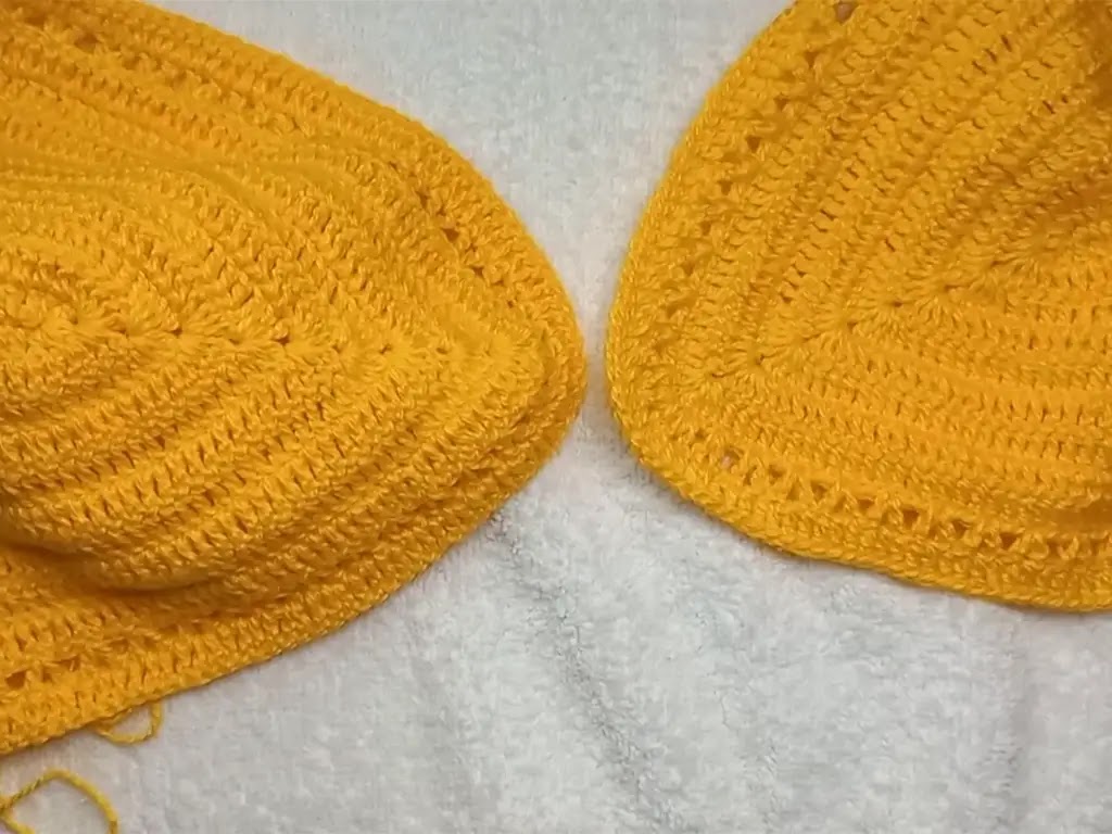 Repeat Steps 1-5: Repeat all the steps from Part 2 (attach yarn, side single crochets, shaping the bottom, work straight) on the other side of the cup to create the back of your top. Tip: You can use stitch markers to mark the center stitch on each side to ensure your cups are symmetrical.