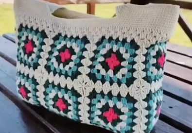 The base of this stylish handbag is made from five identical granny squares, each with 11 rounds.