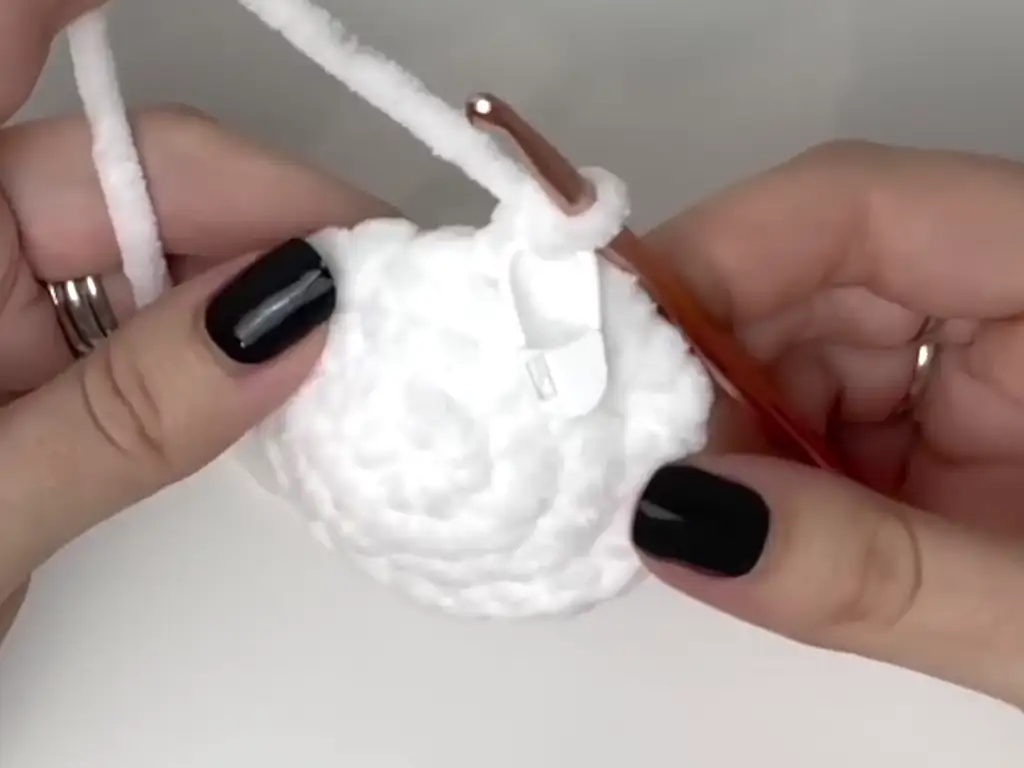 After completing these steps, it’s time to add the safety eyes. Position them between rounds 7 and 8, ensuring they are symmetrical. Afterward, stuff your ghost with polyfill.