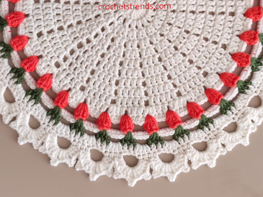To complete the placemat, the final rounds involve a combination of single and double crochets, giving a neat edge to the piece. This not only enhances the placemat’s durability but also adds to its aesthetic appeal.