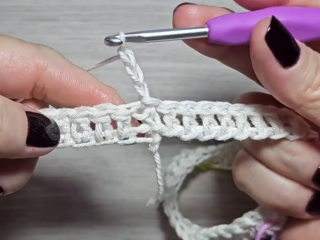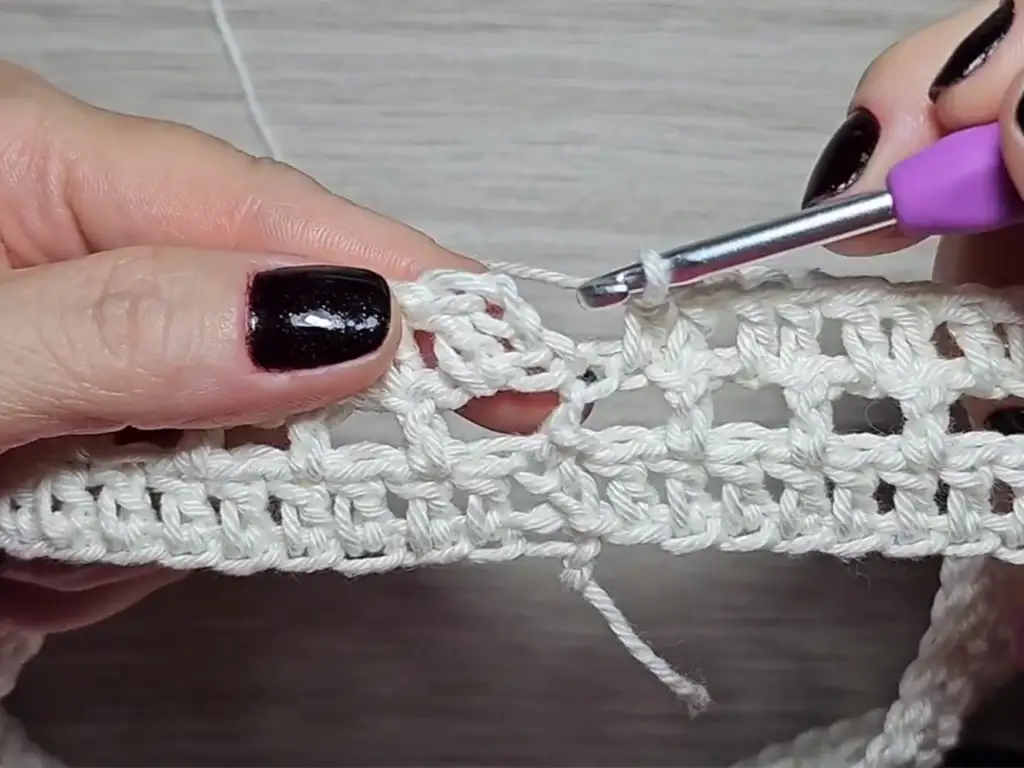 - Ch 3, turn, dc in first dc, ch 1, skip next dc, dc in next dc, ch 1, repeat across, sl st in first dc.