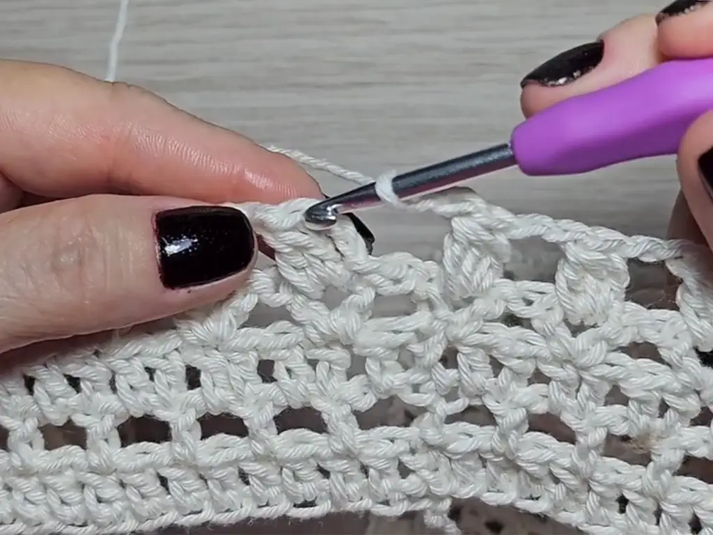 - Ch 3, turn, skip first stitch, dc in next stitch, ch 1, skip next stitch, dc in next stitch, ch 1, repeat across (creating squares), sl st in first dc.