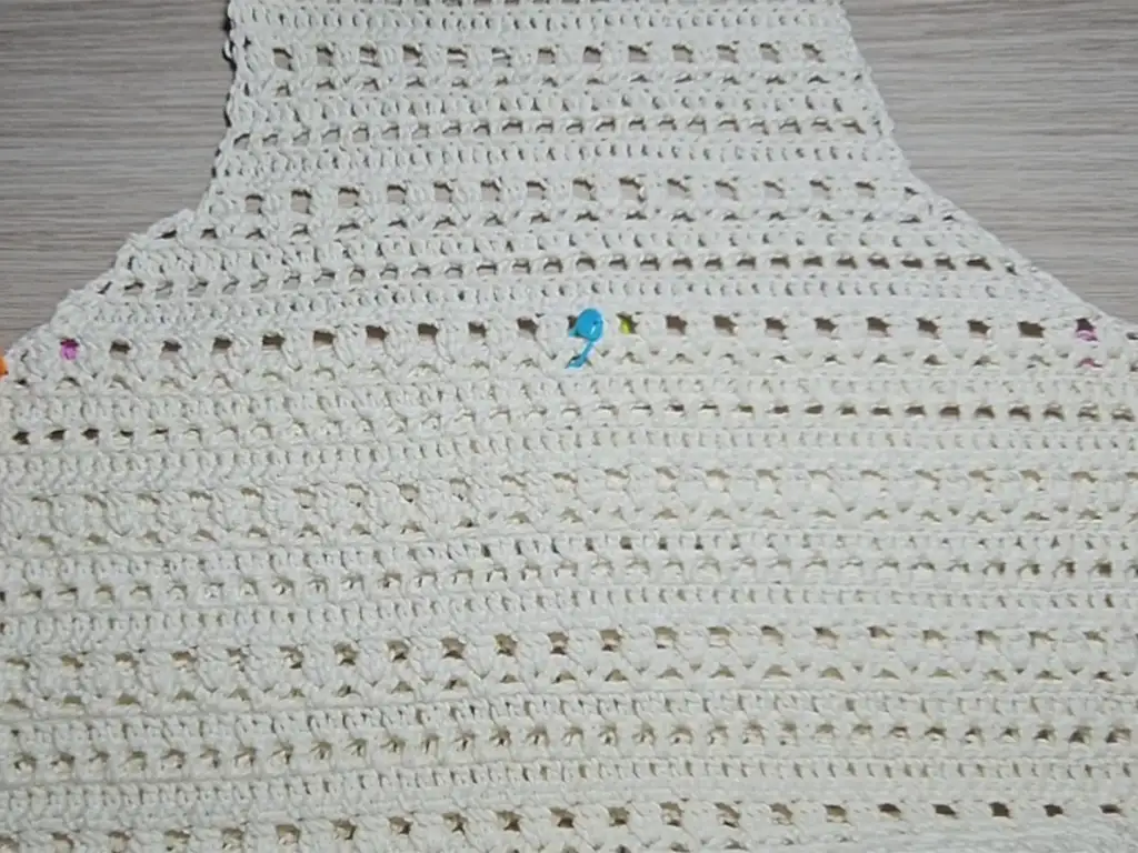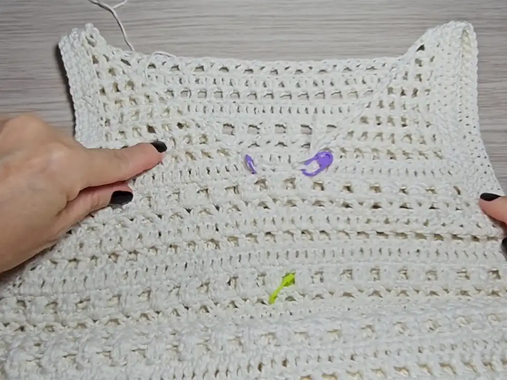 - Work rows of double crochet, squares, neighbors, bubble stitch, and single crochet, following the pattern, but without decreasing stitches to create a straight neckline.