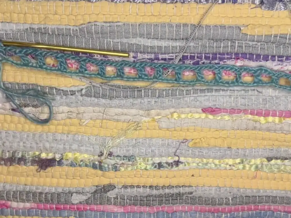 8. Continue working the ch 3, skip 3, dc in the next ch pattern across the chain you made, joining the front and back panels.