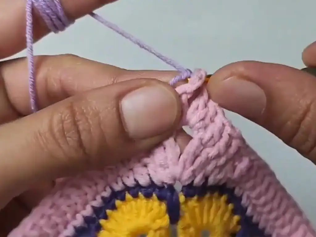 - Choose a contrasting yarn color and join it to the top edge of the bag with a slip stitch.