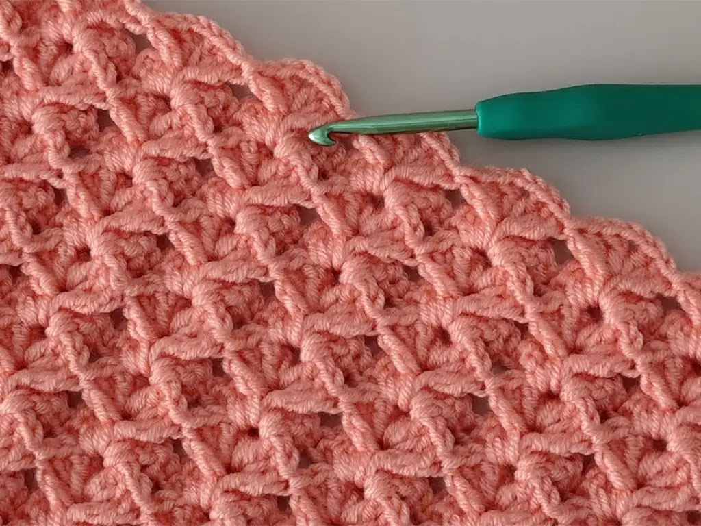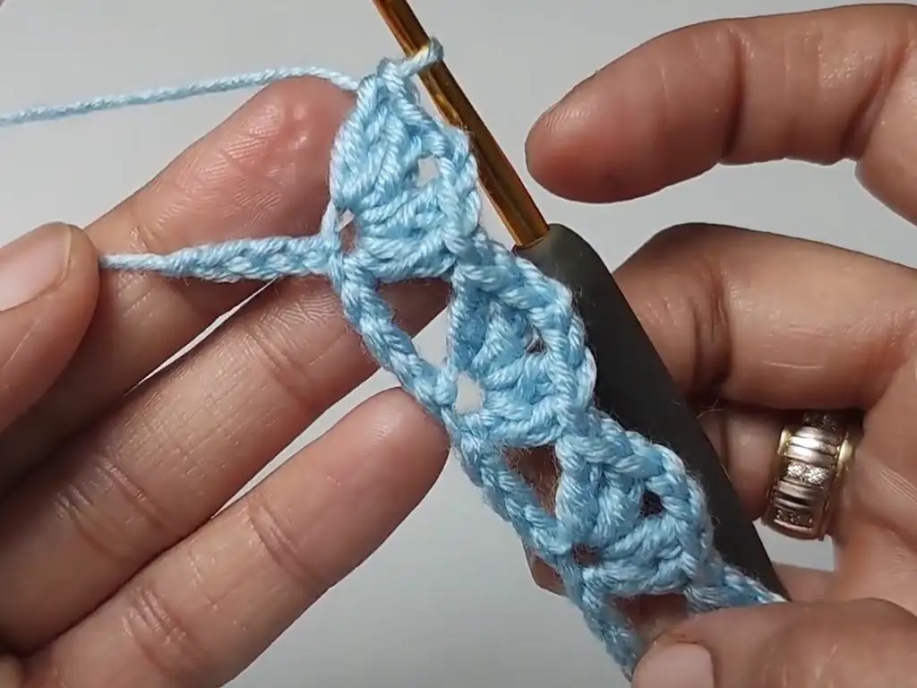 - Repeat this pattern (tr, 2 dc, ch 2, 2 dc, tr) across the row.