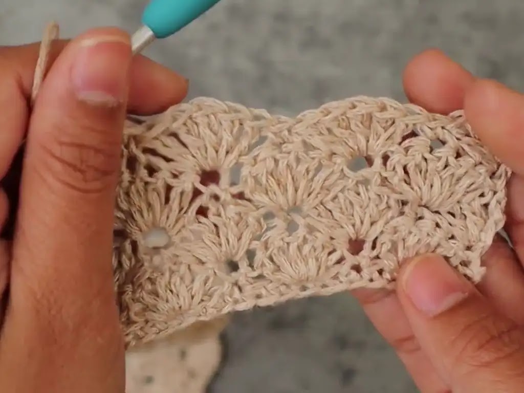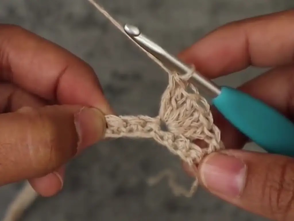 • Row 7: sc in the first 2 stitches, skip 2 stitches, sc in the next 2 stitches, sc across to the last 2 stitches, skip 2 stitches, sc in the last stitch. Turn. (Ch 1)