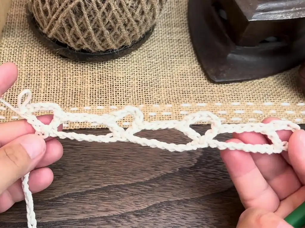 Start by crocheting a chain with a number of stitches that is a multiple of 9, plus a few extra chains for turning (typically 3-5 extra). This chain will be the width of your finished runner.