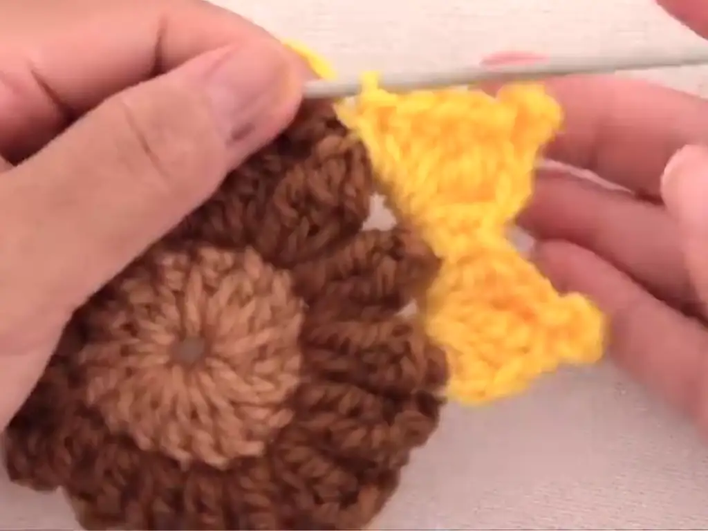 - Join light yellow yarn to any stitch of the center circle. Chain 3 (counts as first dc).