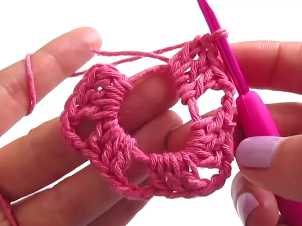 2: Ch 1, [2 dc, ch 3, 3 dc] in ch-3 space, [2 dc] in next st repeat around, ending with sl st to top of ch 1. (15 dc, 5 ch-3 spaces)