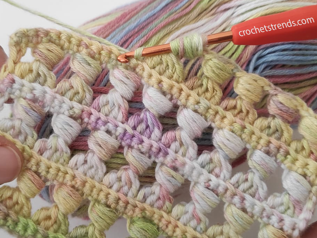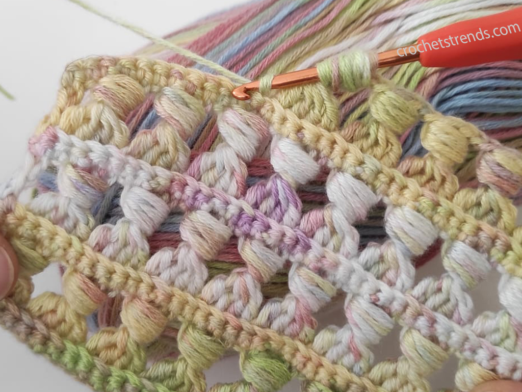 As you reach the end of a row, the pattern calls for a triple crochet to finish. This not only secures the row but also adds a neat edge to the shawl. The pattern is repeated, ensuring consistency and symmetry in the design.